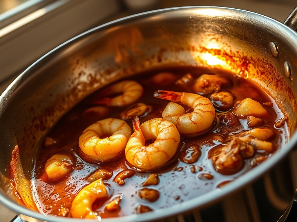 Pro Tip: This is a flash-sear. You are looking for a partial protein set, not a full cook-through. A heavy pan provides the thermal mass necessary to prevent the temperature from dropping when the cold shrimp are added.